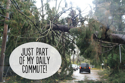 There were THREE of these huge trees resting on the road near our house. I sped through each one on my way to work in the morning. You know, because trees resting on power lines are totally normal, and safe.